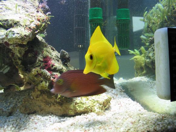 Pärchen Doktoren kurz nach dem Einsetzen, ein gelber (Zebrasoma