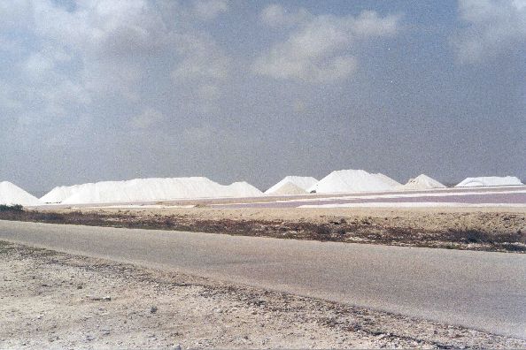 sieht man die Salzberge der ansässigen Salzgewinnung. Im Vordergrund