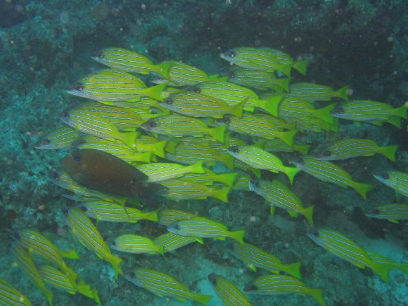 Schwarm Blaustreifen-Schnapper mit einem "getarnten" Doktorfisch
