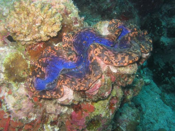 große Muschel im bunten Riff. Der Blödsinn mit Zuschnappen